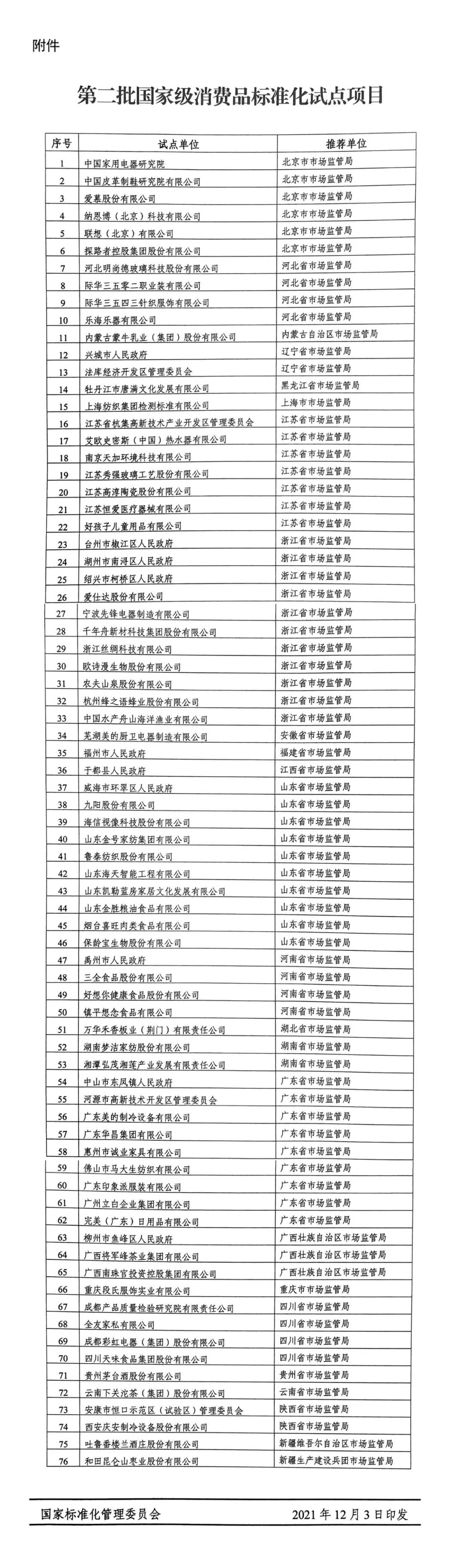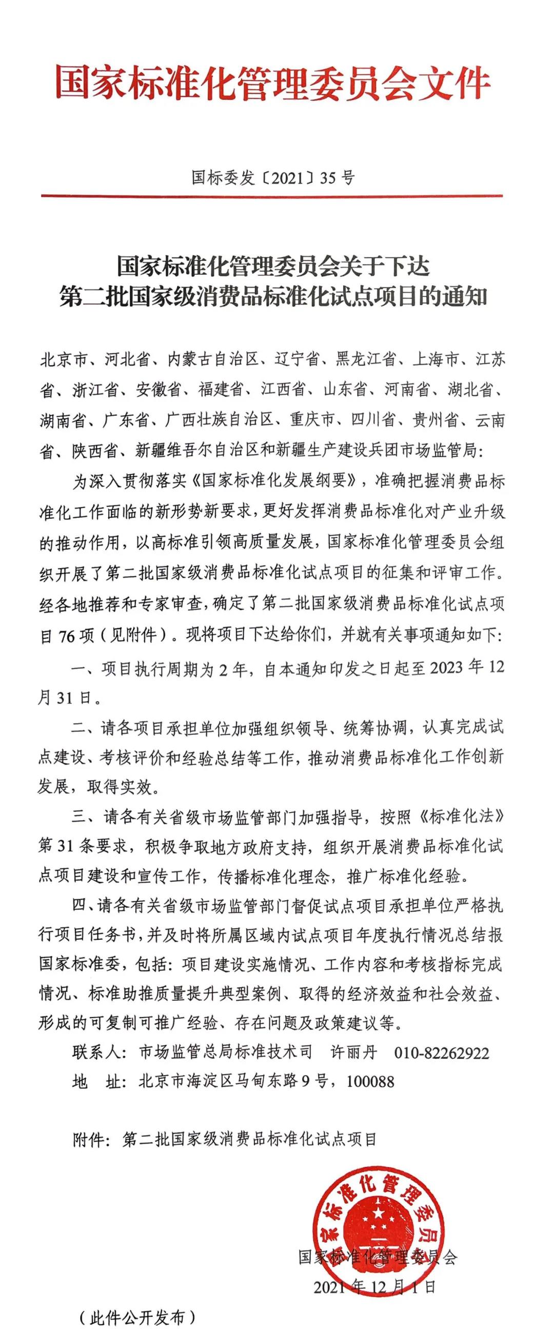 近日,国家标准委下发《关于下达第二批国家级消费品标准化试点项目的通知》,确定了76个第二批国家级消费品标准化试点项目。