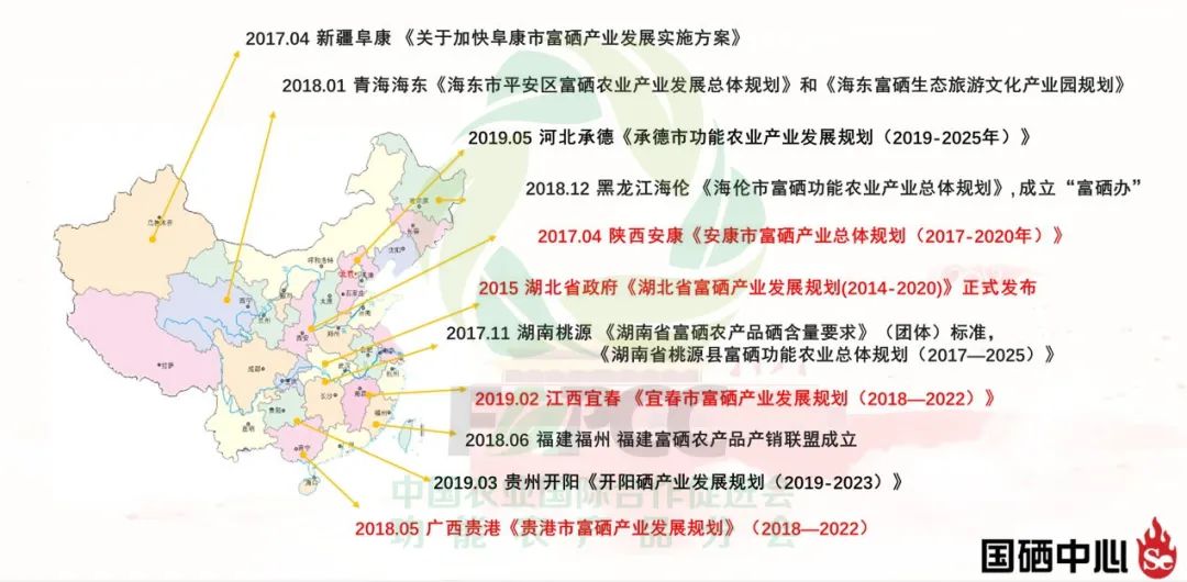 目前已经有是十余个省市地区发布了硒产业发展规划,在富硒标准、产业高质量发展方面下足了功夫。各地区也陆续打造了特色“硒名片”如“世界硒都”湖北恩施,“中国硒谷”陕西安康等。