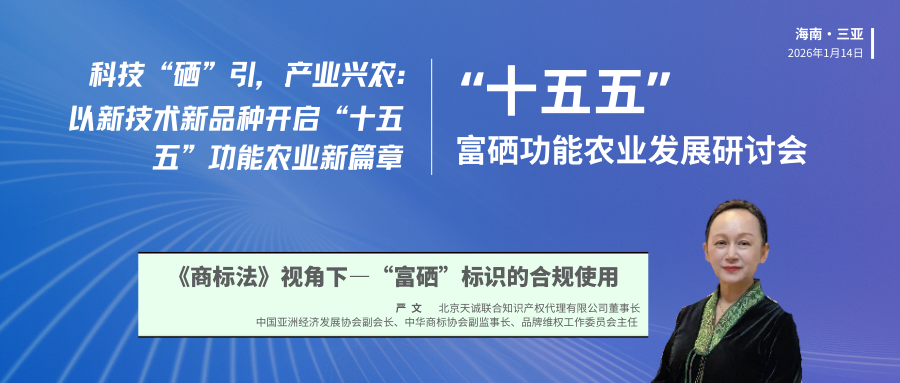 如何精准握政策红线、规避法律风险,实现“富硒”价值的合规传递?定于2026年1月14日在海南三亚的“十五五”富硒功能农业发展研讨会暨新品种、新技术交流会,将邀请到北京天诚联合知识产权代理有限公司董事长、中国亚洲经济发展协会副会长、中华商标协会副监事长、中华商标协会品牌维权工作委员会主任严文进行题为《商标法》视角下—“富硒”标识的合规使用的报告,直击行业痛点,为您提供一场高密度、实战化的合规指南: