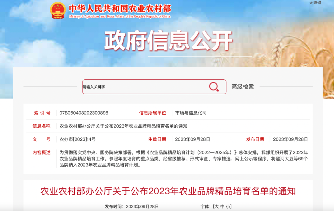 为贯彻落实党中央、国务院决策部署,根据《农业品牌精品培育计划(2022—2025年)》总体安排,农业农村部组织开展了2023年农业品牌精品培育工作。参照年度培育的重点品类,经省级推荐、形式审查、专家推选、网上公示等程序,将黑河大豆等69个品牌纳入2023年农业品牌精品培育计划。
