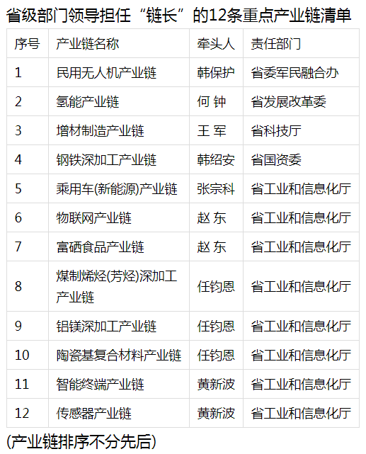 其中数控机床、光子、航空等11条标志性重点产业链由省级领导担任“链长”,其他12条重点产业链由相关省级部门领导担任“链长”。