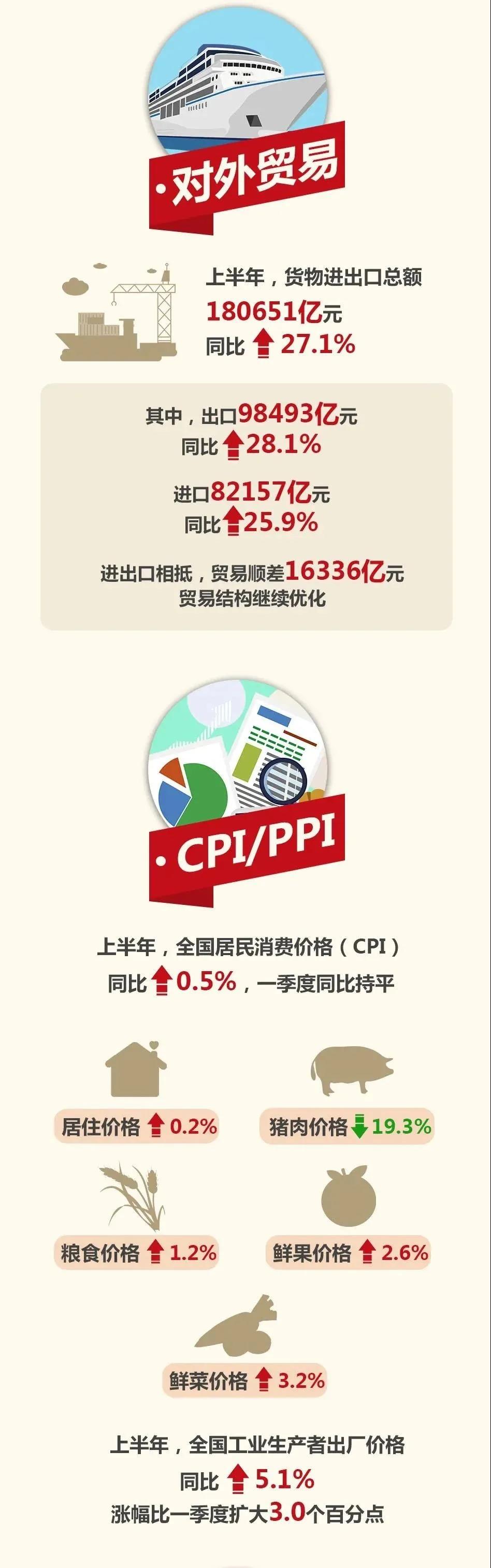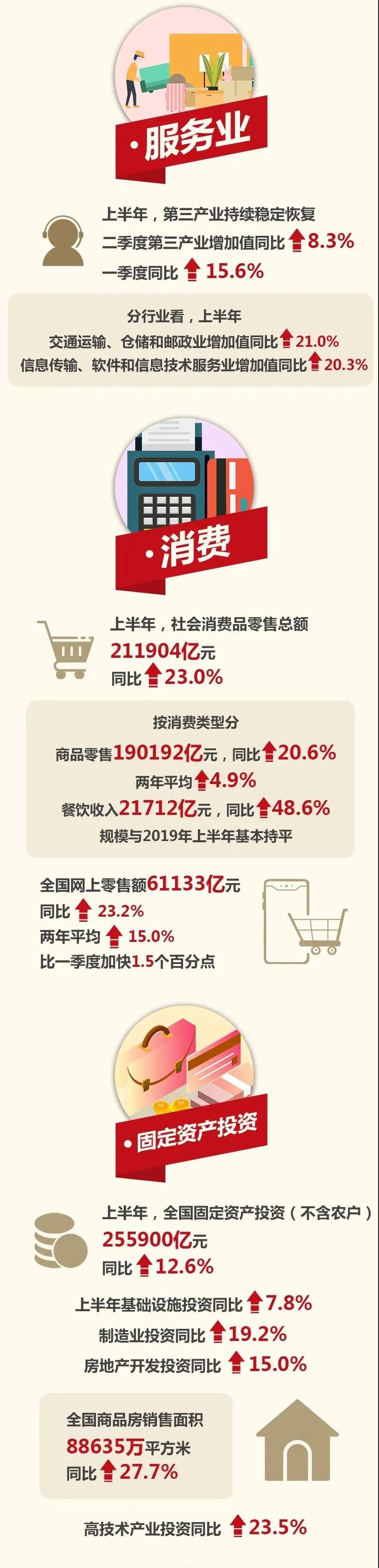 在上半年经济成绩单中,出口表现亮眼,同比增长28.1%,投资和消费作为拉动内需的重要动力,仍在持续恢复中。数据显示:上半年固定资产投资255900亿元,同比增长12.6%。上半年,社会消费品零售总额211904亿元,同比增长23.0%。