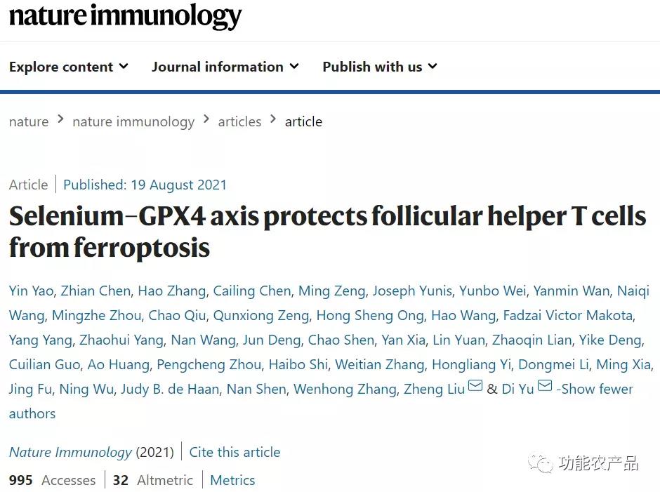 2021年8月19日,昆士兰大学/上海交通大学余迪,华中科技大学刘争及复旦大学张文宏等人在Nature Immunology 在线发表题为“Selenium–GPX4 axis protects follicular helper T cells from ferroptosis”的研究论文,该研究报告了TFH细胞显示出强化的脂质过氧化和线粒体形态改变,类似于铁死亡的特征,这是一种由铁依赖性脂质过氧化积累驱动的程序性细胞死亡形式。