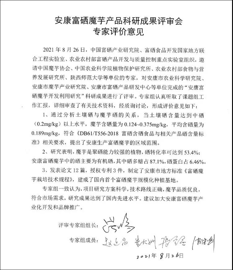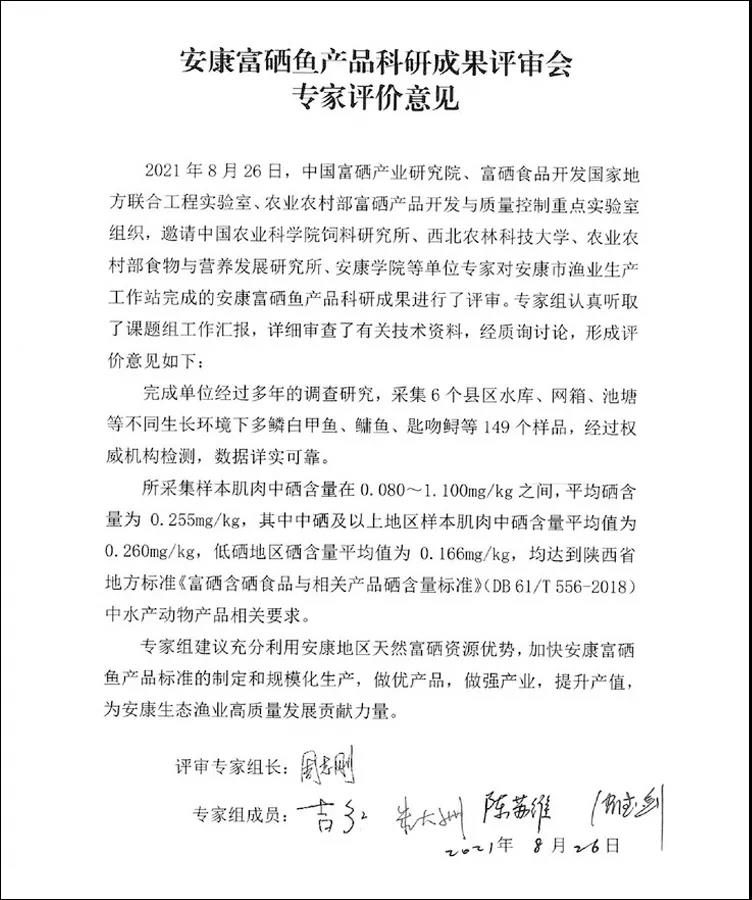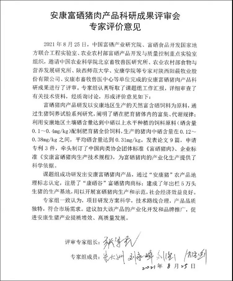 本次评审中,专家组认真听取了课题组工作汇报,详细审查了有关技术资料,经质询讨论后一致认为∶四大富硒特色产业课题研发方案科学、技术路线合理,研究成果达到国内先进水平,天然富硒是安康得天独厚的资源优势,培育开发出的产品品质优良,符合市场需求。建议充分利用安康地区天然富硒资源优势,加快富硒特色产业标准的制定和规模化生产,做优产品、做强产业、提升产值,加大该产品的产业化开发和品牌推广力度,促进产业提质增效。