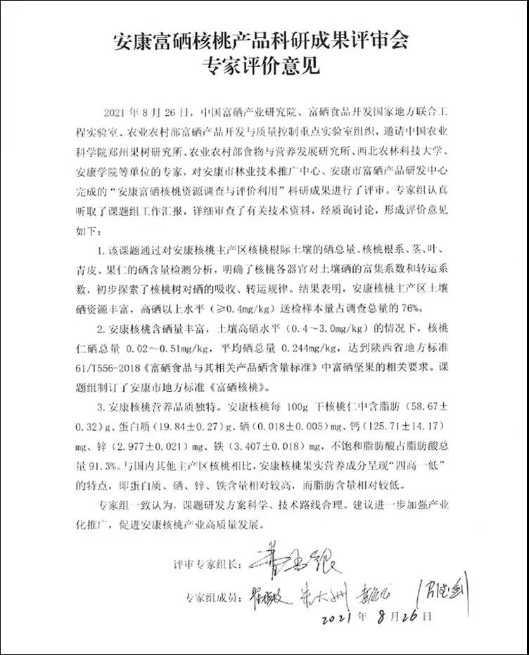 2021年8月25日至26日,安康市富硒产业办公室牵头,中国富硒产业研究院、富硒食品开发国家地方联合工程实验室、农业农村部富硒产品开发与质量控制重点实验室组织,邀请中国农业科学院郑州果树研究所、农业农村部食物与营养发展研究所、西北农林科技大学、安康学院等单位专家,先后对"安康富硒核桃""安康富硒鱼""安康富硒魔芋""安康富硒猪肉"4项产品科研成果进行了评审。早在1989年,"紫阳富硒茶"就通过以中国营养学会理事长沈治平教授为首的13位茶学、营养学、医学专家组成的专家委员会的鉴定,成为全世界首个认定的富硒茶。五大富硒特色产业科研成果通过专家评审认定,更加详实、更加全面、更加精准地定量了安康富硒产品含硒情况,为富硒产业规模化、标准化发展提供了强有力的支撑。至此,安康富硒特色产业步入数据化、精准化发展轨道。