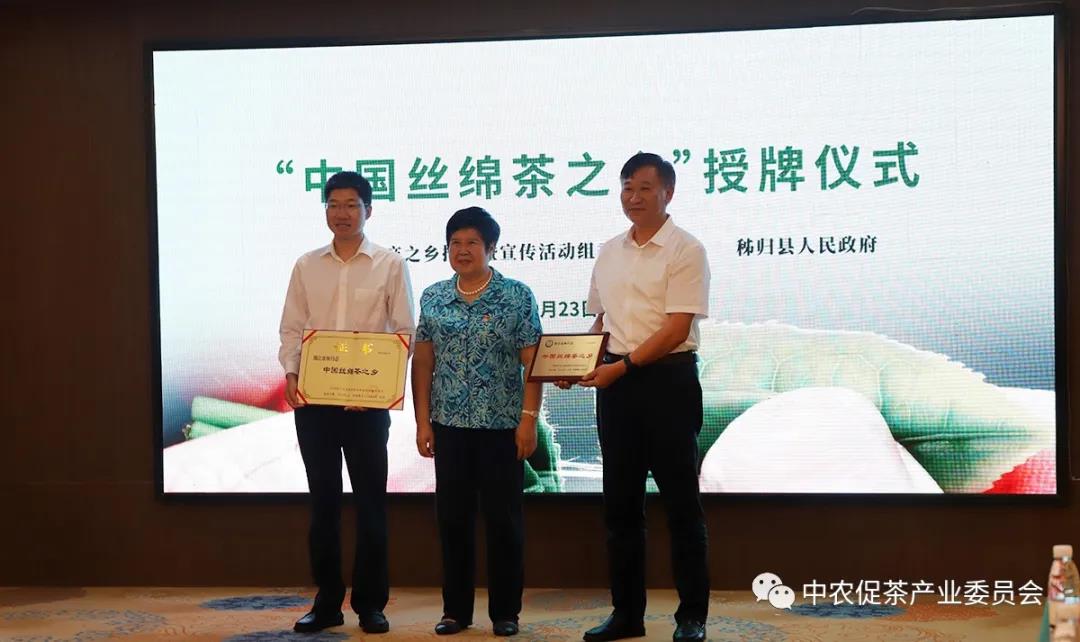 会议期间还开展了授牌仪式,经秭归县人民政府申报,中国特产之乡推荐宣传活动组委会经过书面材料初审、实地调研、专家审评,最终同意授予秭归县“中国丝绵茶之乡”荣誉称号。