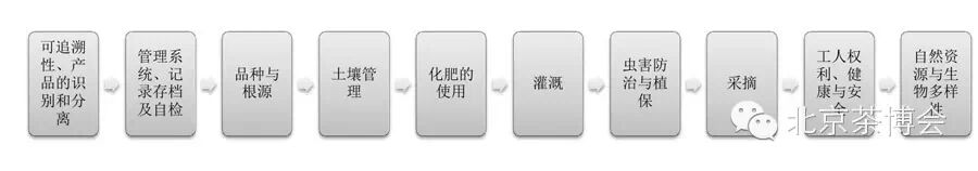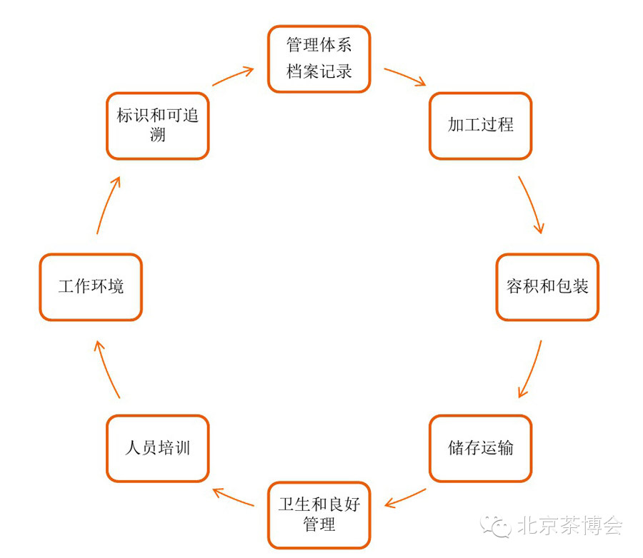 第二个就是关注到自然资源和生态的可持续发展。产业生产过程的质量管理,可以看到这是一个闭合的图(上图),一共有八项,包括管理体系,加工过程及包装,储存运输,良好的人员管理,卫生培训,良好的工作环境,标识和可追溯,整整八个部分。作为一个质量管理体系,说到这个大家可能会知道像ISO9000就是一个质量管理体系,在茶叶行业就是奉行这套国际通用的质量管理体系,上面的这八个部分,其实每个部分内容都非常的多,因为企业在茶叶的生产和管理中会知道,管理体系都很多的方面很多的必查,自查检查项,所以每一项我都不把它拿出来说了,因为时间有限,这八个部分比如良好的卫生管理规定了工人接受基本的卫生培训,规定卫生标识必须明显标识在设备之上,规定了交叉污染,比如开发设备,生产线,空调通风等等。规定了工人的非生产行为必须在指定空间等等,我只是罗列了一些。