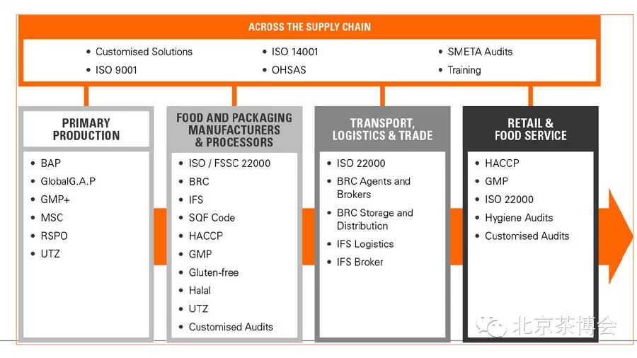 那么如何创造更有价值的茶叶品牌,我指的是在国际贸易中,图上是一些国际知名的买家他们的质量要求,我们说符合他们的质量要求使我们迈向国际市场的第一步,那么上图列出的就是国际上大的买家大的进口国他所要求的质量体系,产品体系因为太多我没有列在其中,比如,有机产品呀,欧盟标准呀。但这些管理体系大家能够看到的关于食品安全,关于茶行业所有的管理体系都在这边,上面是通行的管理体系,像ISO9000,下面这四项,第一个是初级生产,第二个是融合和加工过程,第三个是运输和物流,第四个是零售终端。所有的管理体系都在这边,那么通过对这些管理体系的熟悉或者是通过这些管理体系的要求,我们企业进行质检和资深培训,我们达到一个出口的准备,或者为你的品牌的市场运行奠定一个质量基础。