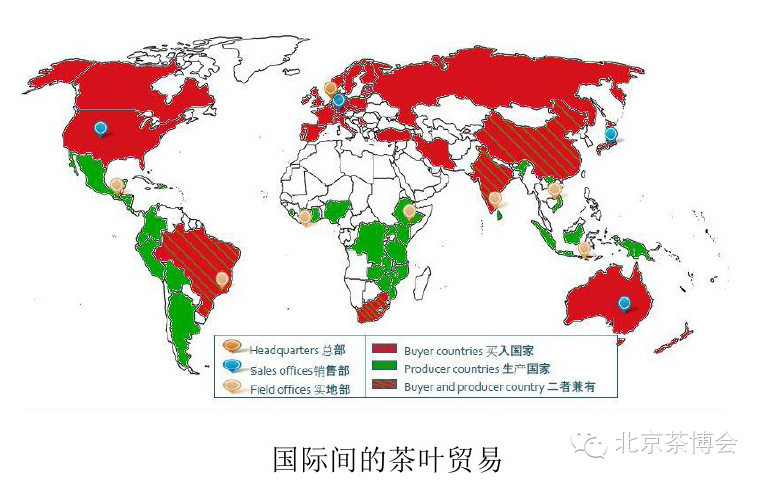 国际贸易引发了更高层次的质量和管理的要求,右面这张图(上图)是世界的国际贸易中茶叶的主要流向,红色的部分是主要的进口国,绿色部分主要是生产国,像中国这样打斜线的,包括像非洲一些国家都是进口和出口兼而有之的,可以看出主要的买方市场还是在欧盟和北美地区。近年,欧盟和北美地区强调最多的是,以前我们强调的是出口的关税和配额,那么现在他们强调更多的是茶是一个负责任的生产方式在生产,强调的是茶一个绿色的贸易壁垒。