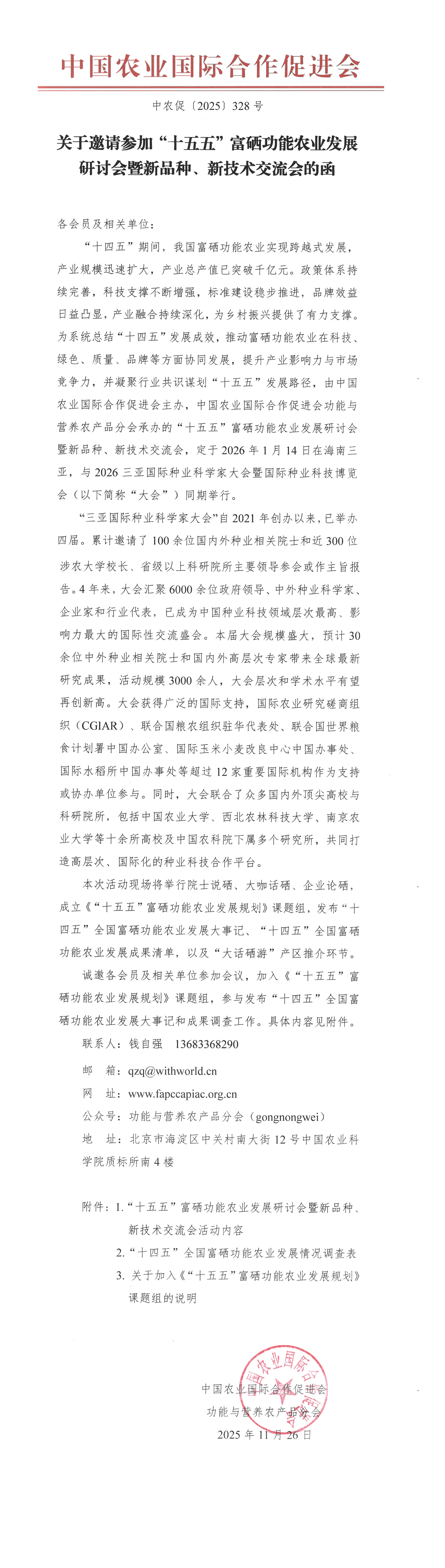 关于邀请参加“十五五”富硒功能农业发展研讨会暨新品种、新技术交流会的函