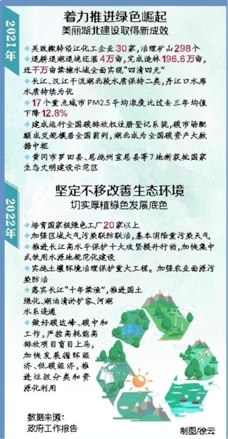 “坚决扛实长江大保护责任、深入推进污染防治、深入推进生态系统保护与修复、深入推进绿色低碳发展……”政府工作报告提出,2022年,湖北要坚定不移改善生态环境,切实厚植绿色发展底色。