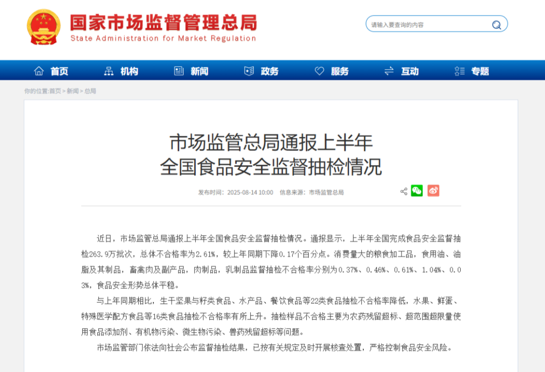 市场监管总局通报上半年全国食品安全监督抽检情况
